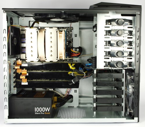 Hlavní podmínkou byl maximální výkon ve vícevláknových aplikacích při co nejnižší hlučnosti. Osadili jsme dva čtyřjádrové procesory. Počítač jsme samozřejmě přetaktovali, čímž již tak extrémní výkon vzrostl nad hranice čehokoliv, co se dá bez taktování na desktopové platformě postavit.