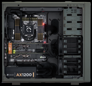 Skříň obsahuje 3x 120mm ventilátor pro dobrý průtok vzduchu. Na čelním panelu jsou vyvedeny dva konektory USB 3.0 a standardní audio konektory (sluchátka a mikrofon).