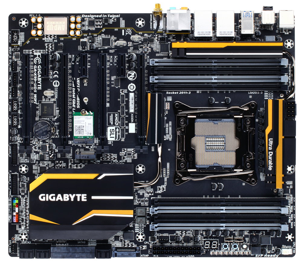 Hi-Endová základní deska podporující všechny moderní technologie (USB 3.0, SATA 6G, SATA-Express, M.2, 7.1 zvuk, RAID, Wifi, Bluetooth, až 64GB RAM…). Díky čtyřem slotům pro grafickou kartu je možné v případě potřeby dosáhnout vyššího počtu monitorů nebo vyššího výkonu pomocí technologie CrossFire nebo SLI.