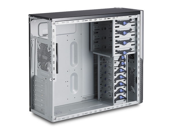 Standardní počítačová skříň bez ventilátoru pro úplně bezhlučný provoz. Na čelním panelu zprava jsou vyvedeny 2 konektory USB 2.0 a audio konektory (sluchátka a mikrofon).