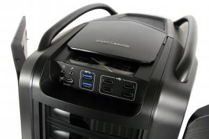 Obří skříň má výborné možnosti chlazení a možnost osazení až 13 pevných disků. Na vrchním panelu jsou vyvedeny dva konektory USB 3.0, čtyři USB 2.0, jeden eSATA a standardní audio konektory (sluchátka a mikrofon). Možnost využití konektorů závisí na základní desce a ostatních připojených zařízeních.