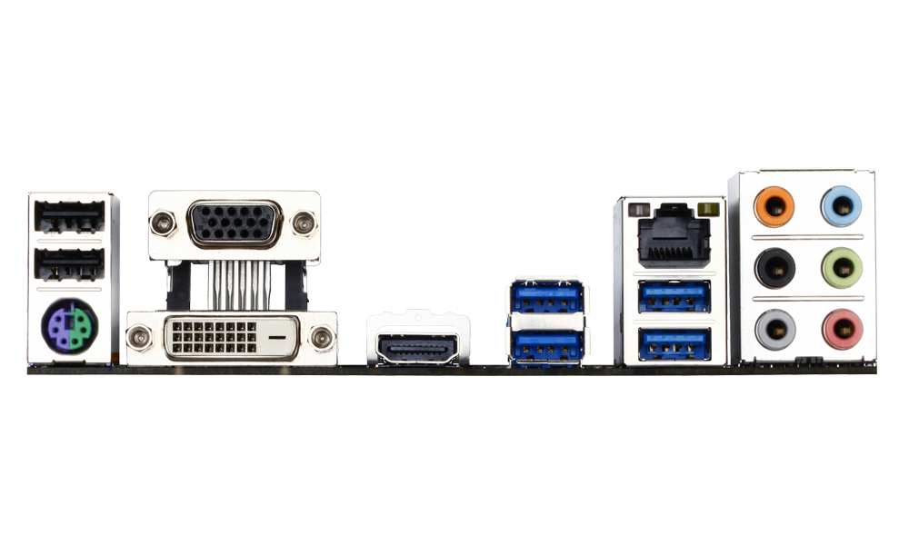 Základní deska vyvádí dozadu počítače tyto konektory: 2x USB 2.0, 4x, USB 3.0, 1x PS/2, 1x Gbit síť, Jack výstupy pro až 7.1 reproduktory, výstupy integrované grafiky (HDMI, DVI, D-SUB)