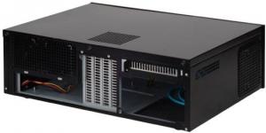 Ležatá HTPC skříň formátu mATX. Na čele skříně jsou dva USB 3.0 konektory a běžné audio konektory (sluchátka a mikrofon).