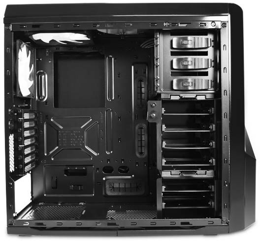 Má výborné možnosti chlazení. Dodává se s jedním 140mm ventilátorem a dvěma 120mm ventilátory, které se starají o průtok vzduchu skříní. Na čelním panelu jsou vyvedeny dva konektory USB 3.0, dva USB 2.0 a audio konektory (sluchátka a mikrofon).