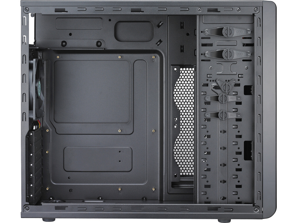 Dodává se se 120mm ventilátorem, který se stará o průtok vzduchu skříní. Na čelním panelu nahoře je vyveden jeden konektor USB 3.0, dva konektory USB 2.0 a audio konektory (sluchátka a mikrofon).